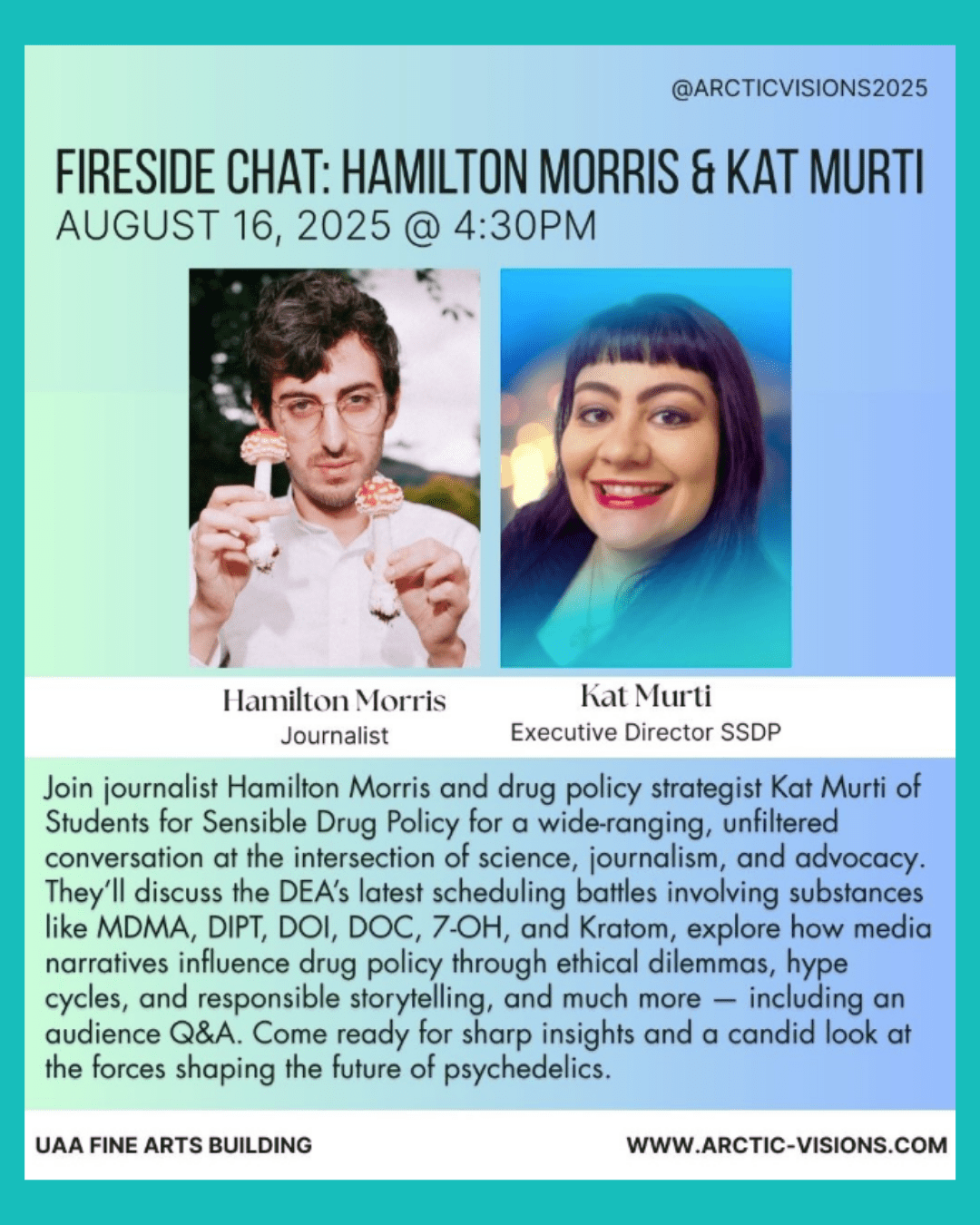 Join us at the Arctic Visions Psychedelic Conference taking place at the University of Alaska Anchorage’s Fine Arts Building this Friday and Saturday. SSDP will be hosting a booth on-site, sharing info on our policy projects, public committees, and our newly launched HOPE program.