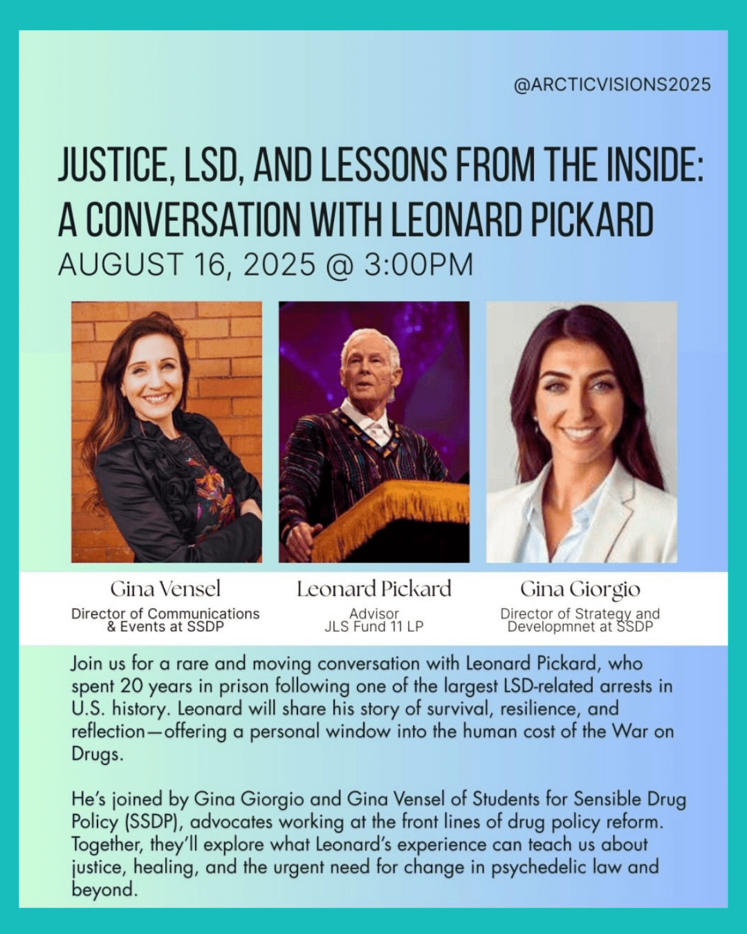 On Saturday of the conference, SSDP’s Director of Strategy and Development, Gina Giorgio, along with gina vensel, Director of Communications & Events, will be having an engaging discussion with psychedelic legend Leonard Pickard, “Justice, LSD, and Lessons from the Inside” with stories of his 20 years in prison following one of the largest LSD-related arrests in US history.