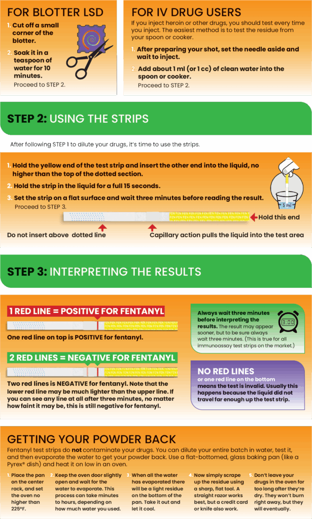 According to the CDC, over 150 people die every day from overdoses related to synthetic opioids like fentanyl. Fentanyl test strips can be a reliable way to check your drugs, helping to detect the presence of fentanyl before it’s too late. Be careful though: false positives (especially when testing stimulants) and false negatives can happen. In a 2017 study, out of 210 samples tested, 3.7% were false negatives. Test your substance multiple times to limit your chance of consuming fentanyl.