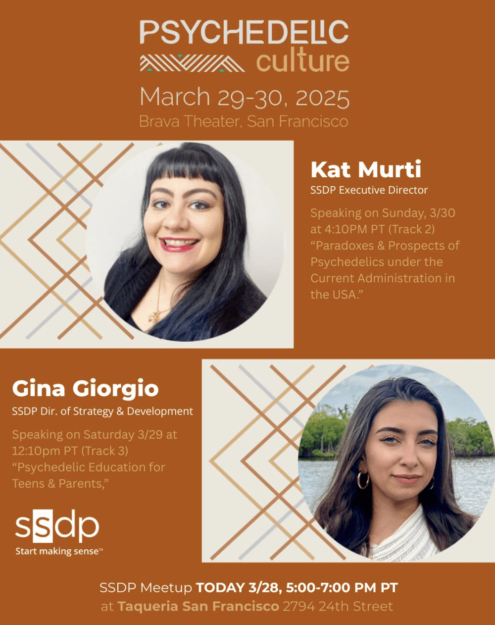 The momentum continues, as SSDP leadership prepares for another dual-set of conferences on both sides of the Mississippi this weekend – with a delegation set to attend the Chacruna Institute’s annual Psychedelic Culture Conference in San Francisco on March 29th and 30th, which will bring together researchers, practitioners, and advocates to explore the cultural and spiritual dimensions of psychedelics. For Psychedelic Culture attendees looking for “the others” prior to the start of the conference on Saturday morning, join SSDP team members later today at Taqueria San Francisco from 5:00 – 7:00 PM (PST) for an assuredly engaging, moderately informal meetup.
