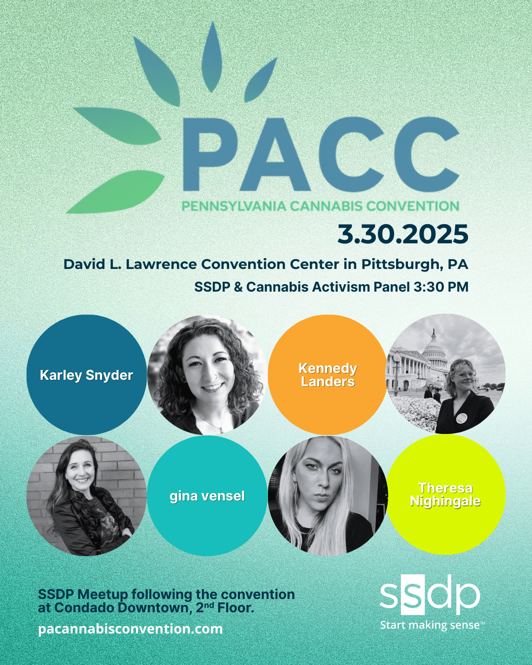 SSDP Board members and Pittsburgh Community Chapter members will be hosting a panel, “Cannabis Activism with SSDP” at 3:30pm on Sunday including Board Chair Karley Snyder, Board members Kennedy Landers and gina vensel, and Pittsburgh Community Chapter member Theresa Nightingale.