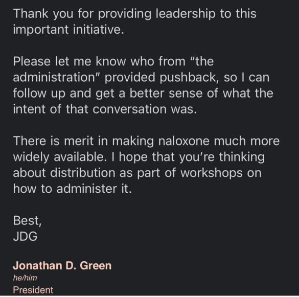 “There is merit in making naloxone much more widely available,” Green wrote in a letter to Landers and SU SSDP.